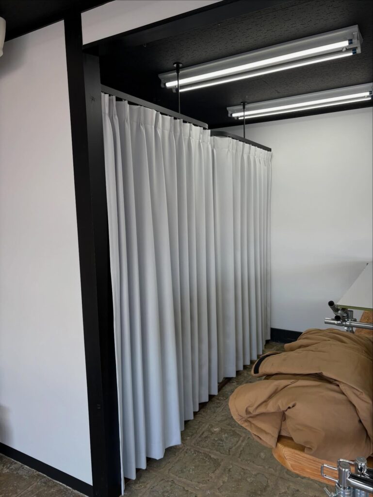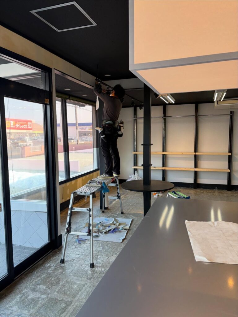 - 什器周りの細部まで美しく 店舗特有の棚受け柱やカーテンレールなど、細かい切り込みが必要な箇所も、職人の手仕事で隙間なく丁寧に仕上げています。